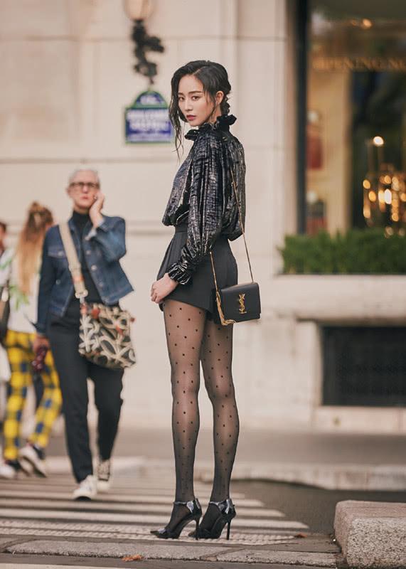 張鈞甯是身高比較高,因此比較適合那些顯氣場的穿搭,像以上這身,張鈞甯穿荷恭弘=恭弘=叶 恭弘 恭弘領的亮片長袖,然後再搭配短褲,接着,再穿上一雙細高跟鞋,一套很酷的裝扮就完成了。
