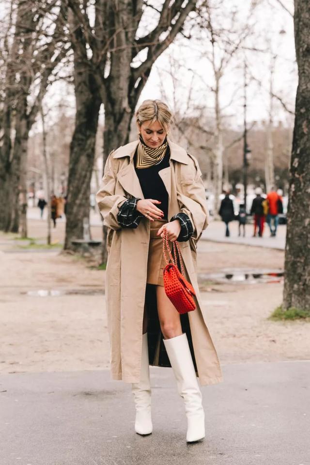 風衣當成裙子來搭配中筒靴,減弱了風格的帥氣硬朗,增加了優雅知性的感覺。