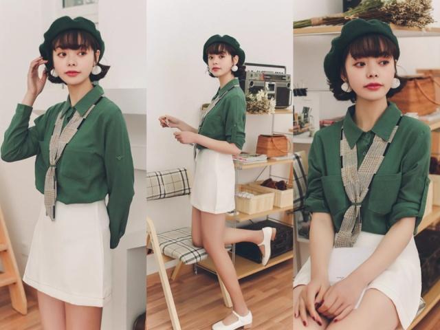 搭配look1:綠色襯衫+白色半裙
