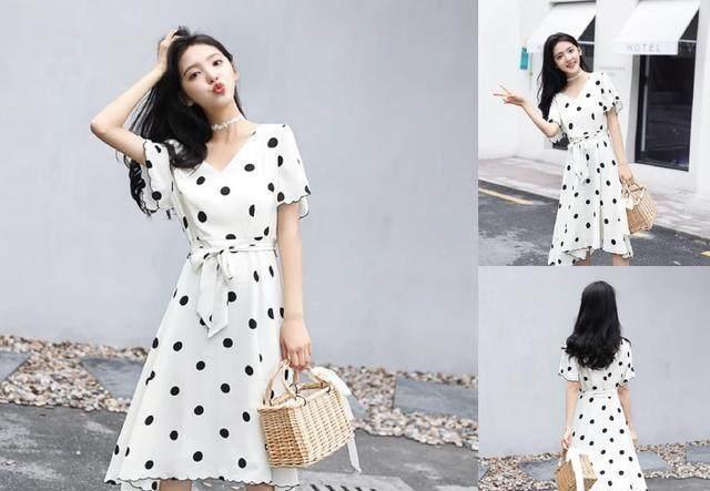 1、腰帶款黑白色波點連衣裙
