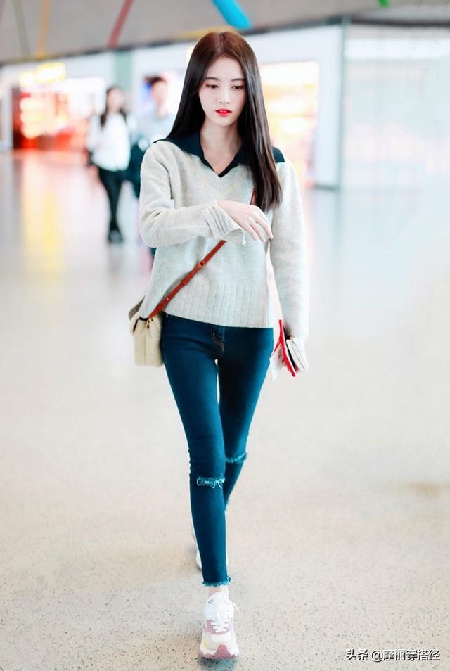 在搭配的時候,宋祖兒選擇了撞色系的搭配,橘紅色的針織衫搭配了一條軍綠色的九分褲,在穿針織衫的時候,看到宋祖兒採用了斜邊的穿法,這麼穿顯得很潮,走在機場里不亮眼才怪呢。