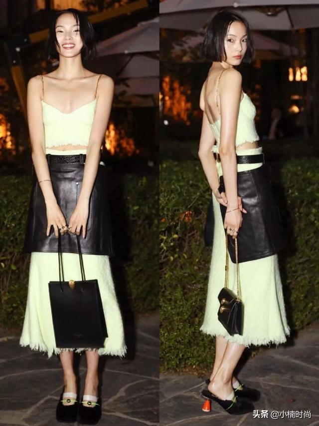 ▲皮質的外套質地硬挺,穿上身非常的有型,加上劉雯身材高挑,完美的hold住皮衣。