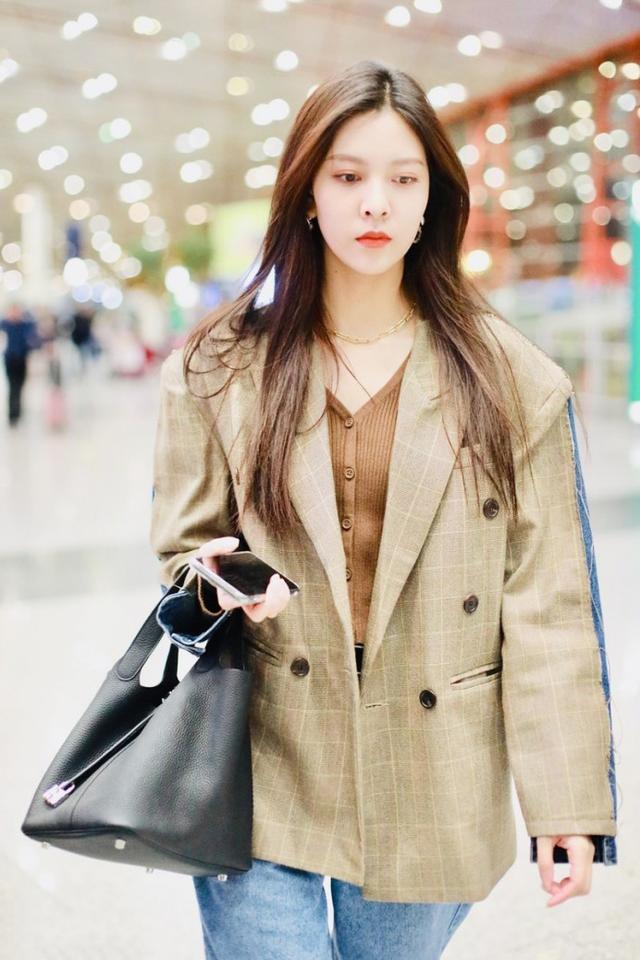 韓風在很長一段時間裏面都受到姑娘們的追崇,這種風格倒是真的很妥,至少對於大部分的姑娘來說是這樣的。今年,這樣的風格又有蠢蠢欲動要大地回春的架勢。可以發現在很多明星的機場look中都隱約可見這種風格的彰顯,就像宋妍霏的這組look。棕色調的線衫搭配oversized格紋西裝,韓流風很明顯。亦或是下裝消失look,吸睛效果一樣很棒。