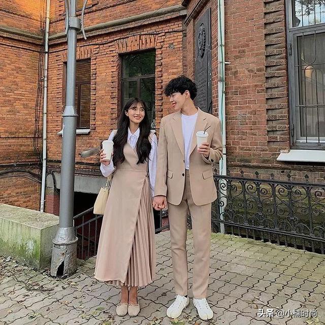 ▲同色的純色搭配,大面積的同色相呼應,一下子就能看出來了。裸色是溫和的顏色,特別的顯氣質,不論男女生穿上都會很溫柔。在衣服的款式上,女生是一件不規則剪裁的連衣裙,簡單的裙片下是百褶的裙身,簡繁結合,很巧妙的設計。內搭一件白襯衫,使造型增添一點正式感,正好和男友的西裝搭配有所結合。