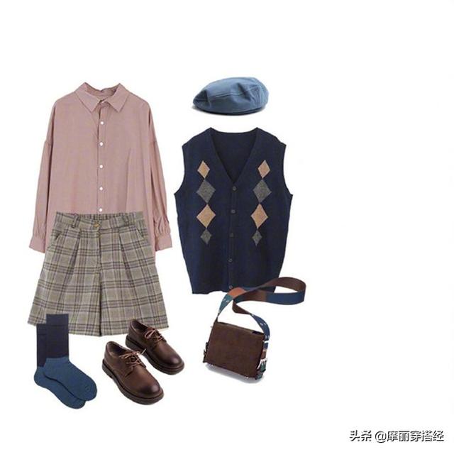 其實純色的襯衫蠻好搭的,只是這件粉色的襯衫比較減齡,穿不好的話,就“毀所有”了。所以馬甲得選擇這種帶有菱格印花修飾的,復古又顯文藝風,變身“寶藏”女孩。而極具學院風的格紋短褲,成為了整個造型的點睛之筆,青春范十足。